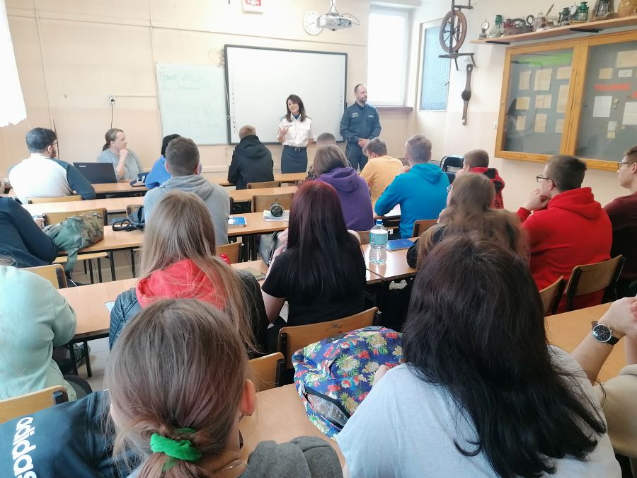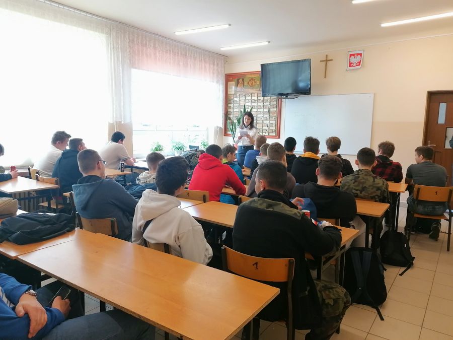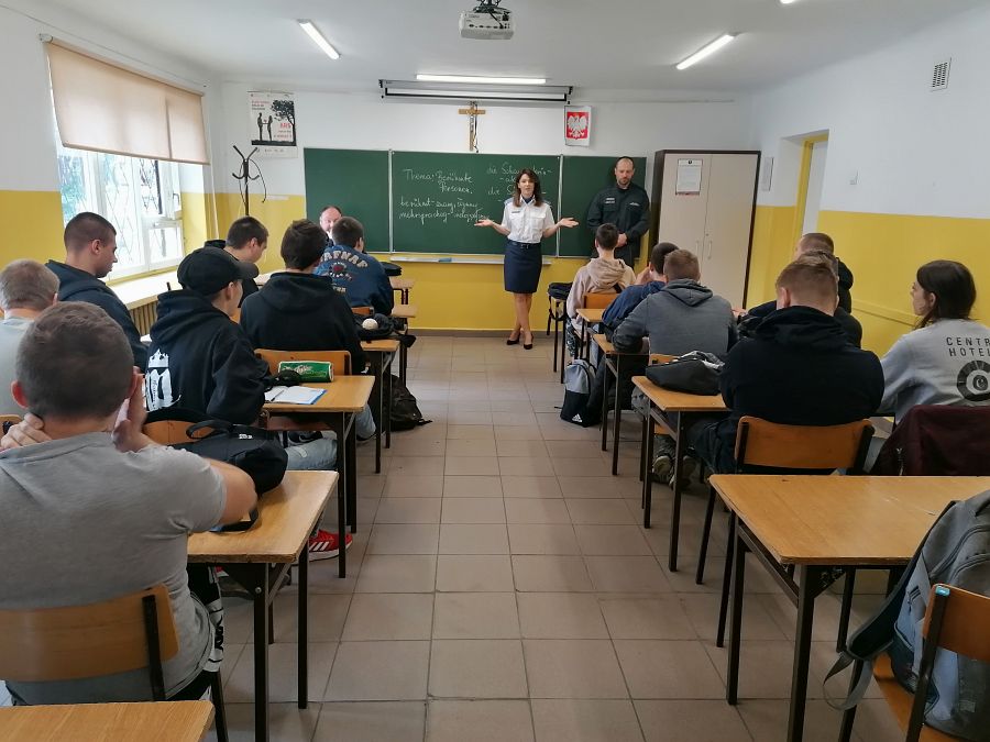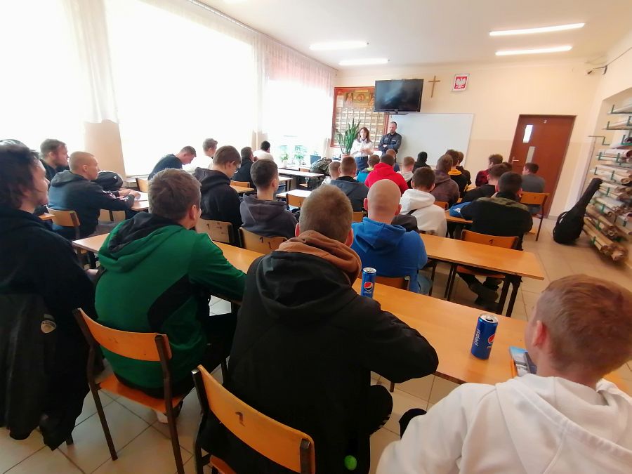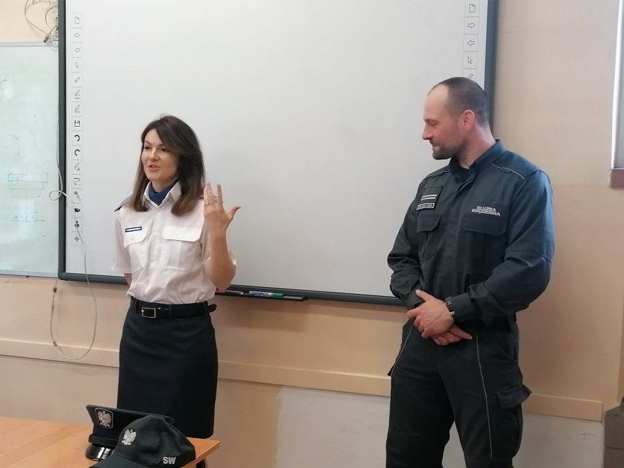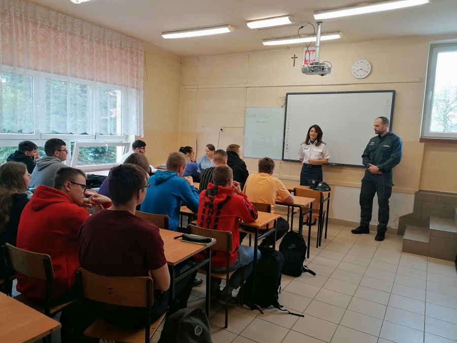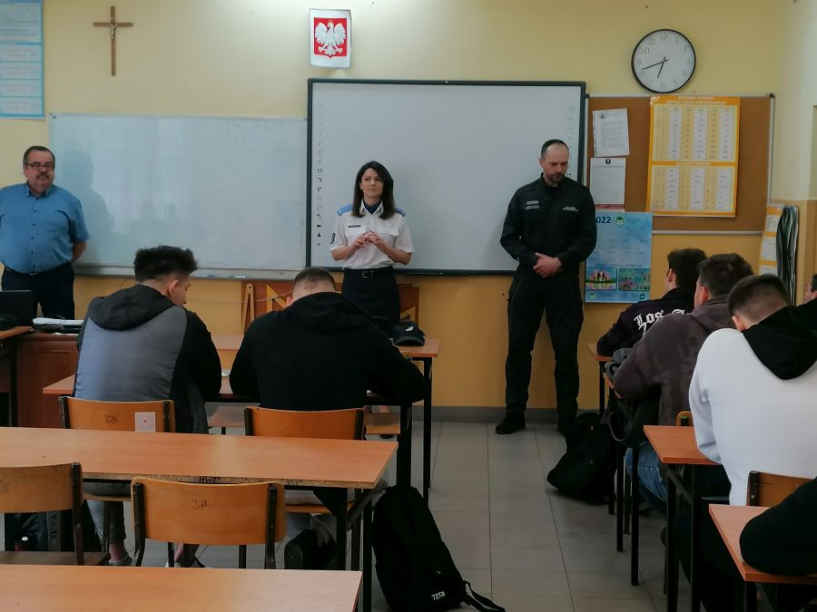 W dniu 27 kwietnia 2022 w murach naszej szkoły odbyły się spotkania i zajęcia profilaktyczne z funkcjonariuszami Zakładu Karnego w Chełmie: funkcjonariuszem działu ochrony oraz psychologiem oddziału terapeutycznego. Podczas spotkań młodzież z klas: 3S, 3MR, 3kgim, 3ekp i 2RT miała okazję zapoznać się ze specyfiką pracy, którą na co dzień wykonują funkcjonariusze Służby Więziennej oraz strukturą organizacyjną tejże jednostki. Przedstawiono role i zadania formacji w strukturze bezpieczeństwa państwa jak również procedury związane z naborami do formacji zachęcając jednocześnie do podjęcia pracy w jednostkach penitencjarnych. Pani psycholog przedstawiła przykłady młodych ludzi, którzy kierowani ciekawością, bądź chęcią przypodobania się towarzystwu, spróbowali dopalaczy, narkotyków, w konsekwencji uzależnili się od nich tracąc zdrowie, wolność a nawet życie. Młodzież zadawała wiele pytań dotyczących osób odbywających kary pozbawienia wolności, warunków w jakich odbywają kary i powodów przez które trafili do izolacji.
