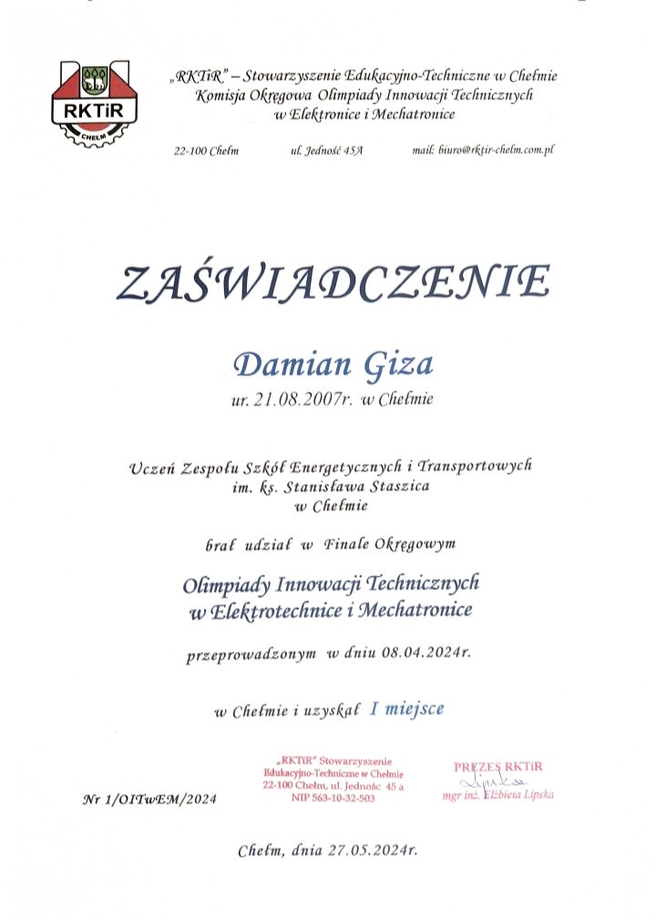 Z ogromną radością chcielibyśmy poinformować, że Damian Giza, uczeń klasy II technikum mechatronicznego brał udział w Finale Okręgowym Olimpiady Innowacji Technicznych w Elektronice i Mechatronice i uzyskał I miejsce.