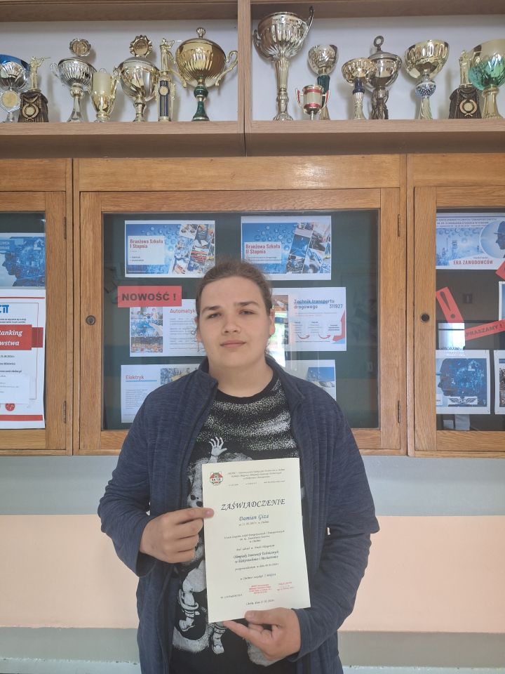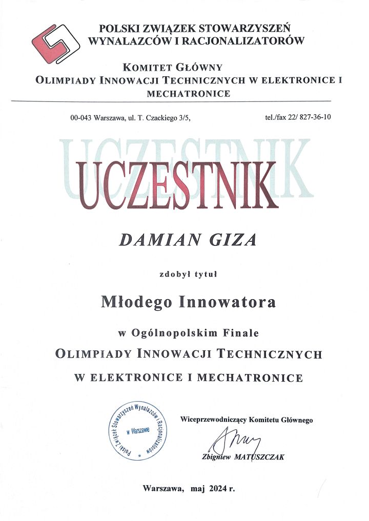 Opiekunem merytorycznym Damiana był Pan Sławomir Szajner, nauczyciel przedmiotów mechatronicznych i elektronicznych. Gratulujemy i życzymy dalszych sukcesów!