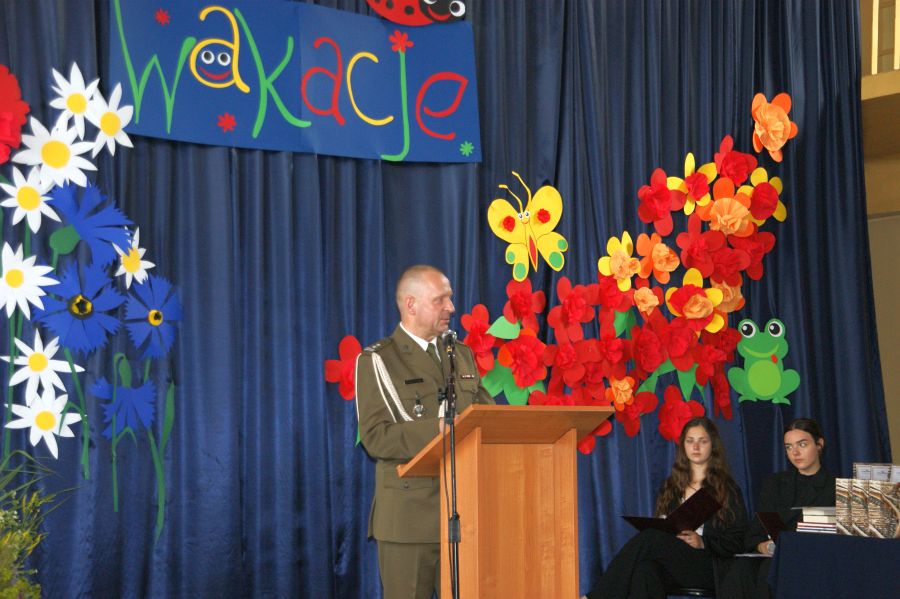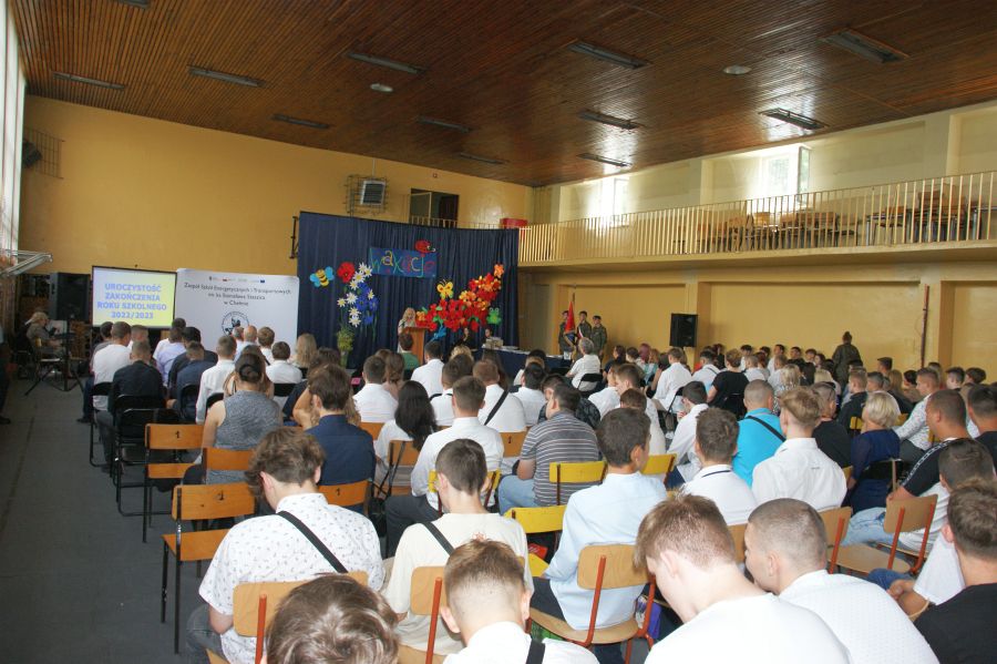 Uczniowie i nauczyciele Zespołu Szkół Energetycznych i Transportowych zgromadzili się 23.06.2023 r. o godz.10.00 w sali gimnastycznej, aby oficjalnie zakończyć rok szkolny 2022/2023. Uroczystość uświetnili swoją obecnością: dowódca Wojskowego Centrum Rekrutacji w Chełmie p. ppłk Andrzej Stachyra, przewodnicząca Rady Rodziców p. Anna Krzyżanowska oraz przybyli rodzice.