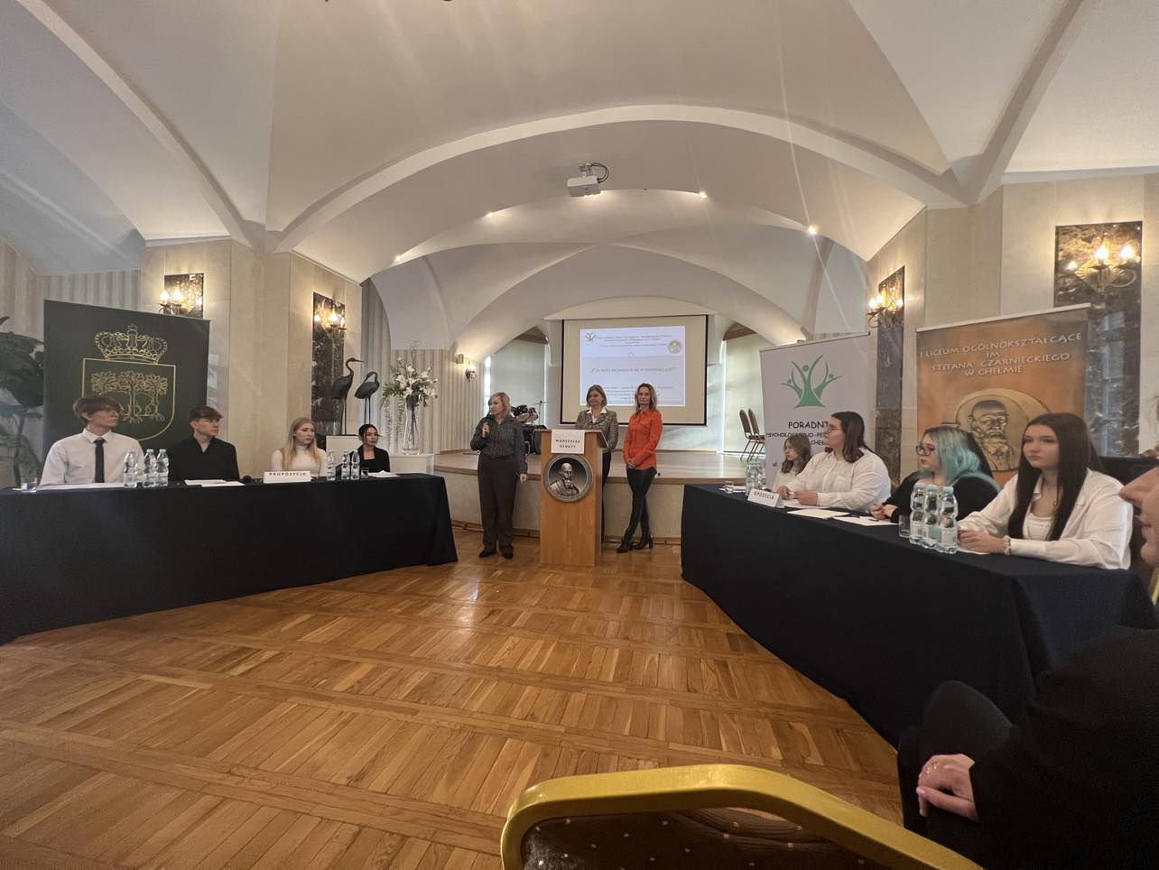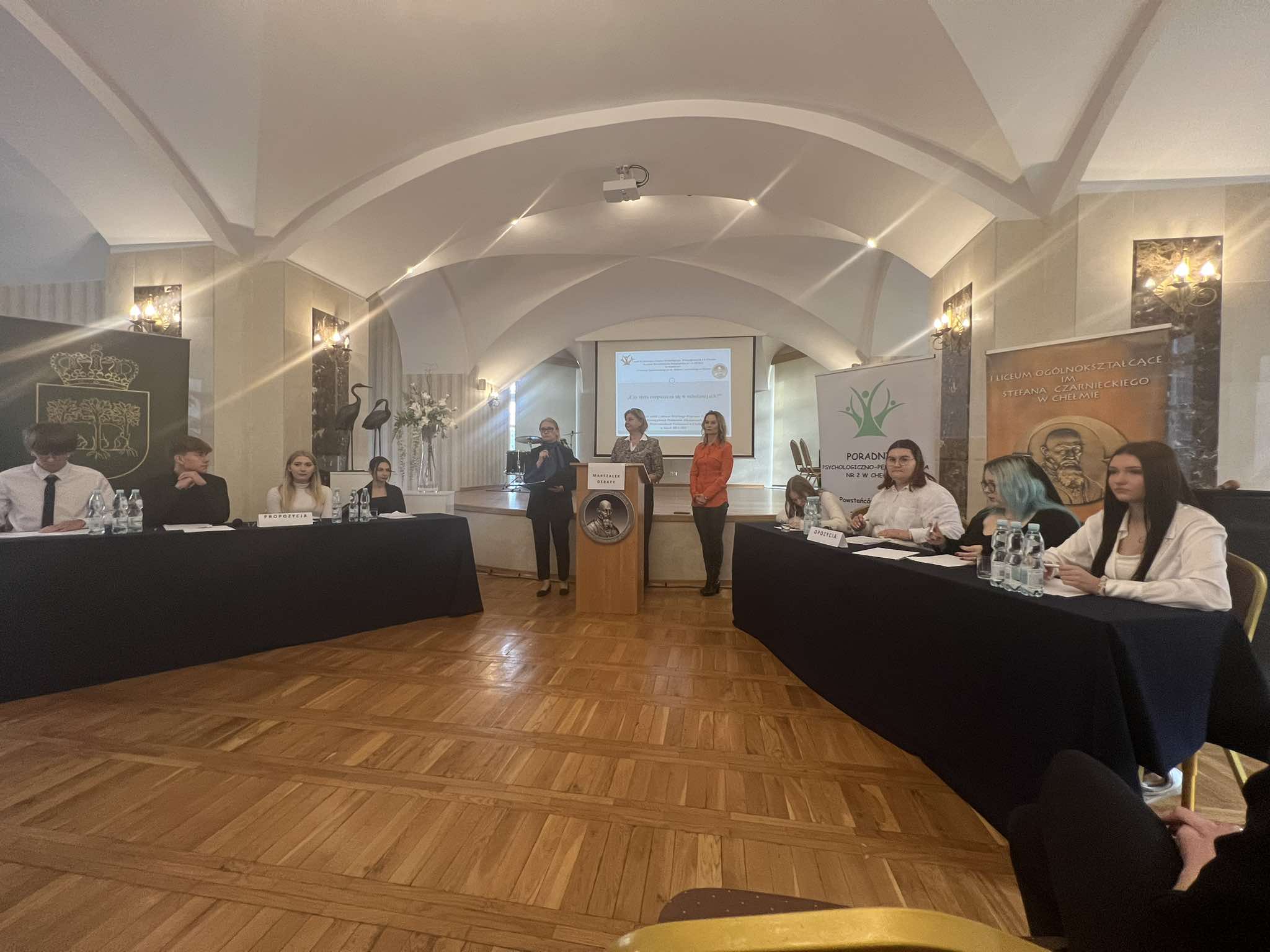 3 grudnia 2024r. delegacja uczniów z kl. 2 SL wzięła udział w debacie międzyszkolnej pod hasłem „Czy stres rozpuszcza się w substancjach?”. Spotkanie zostało zorganizowane przez Poradnię Psychologiczno-Pedagogiczną nr 2 w Chełmie w ramach realizacji programu „TAK – dla życia, NIE – uzależnieniom”. W debacie wzięli udział przedstawiciele chełmskich szkół ponadpodstawowych. Naszą szkołę reprezentowała Julia Kister, która będąc po stronie opozycji przekonywała, że stres nie rozpuszcza się w substancjach oraz, że są bardziej skuteczne i naturalne sposoby radzenia sobie z nim. Debatę podsumowała pani Agnieszka Walewska-Maksymiuk - Dyrektor Departamentu Oświaty Urzędu Miasta Chełm.