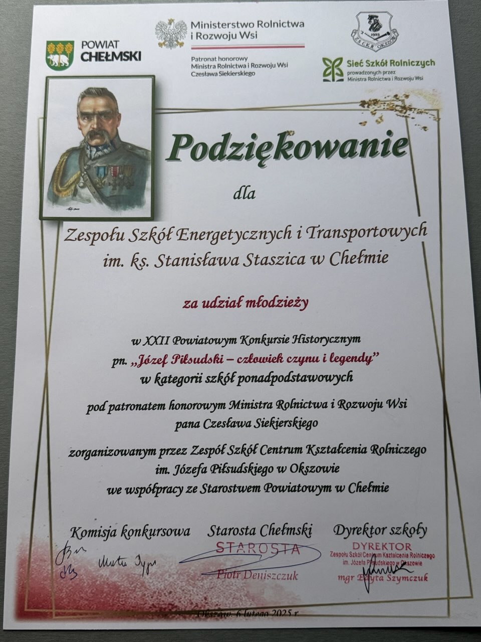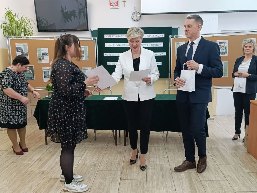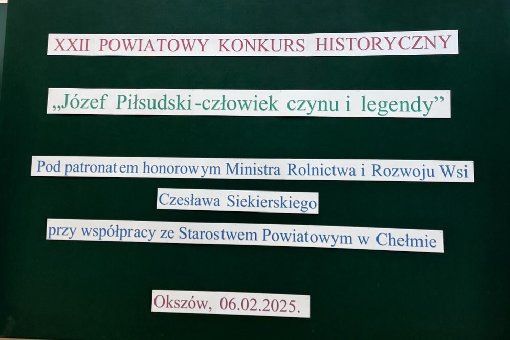 W dniu 6 lutego 2025 roku uczennice naszej szkoły Martyna Fas i Jagoda Wrońska z klasy III mk reprezentowały naszą szkołę w XXII Powiatowym Konkursie Historycznym pn. Józef Piłsudski - człowiek czynu i legendy zorganizowanym przez Centrum Kształcenia Rolniczego im. Józefa Piłsudskiego w Okszowie. Konkurs objęty był honorowym patronatem Ministra Rolnictwa i Rozwoju Wsi Pana Czesława Siekierskiego przy współpracy ze Starostwem Powiatowym w Chełmie. Delegatki naszej szkoły otrzymały 30 pkt. w teście wiedzy historycznej. Opiekunem merytorycznym Martyny i Jagody była Pani Katarzyna Karamać nauczyciel historii w ZSE i T w Chełmie.