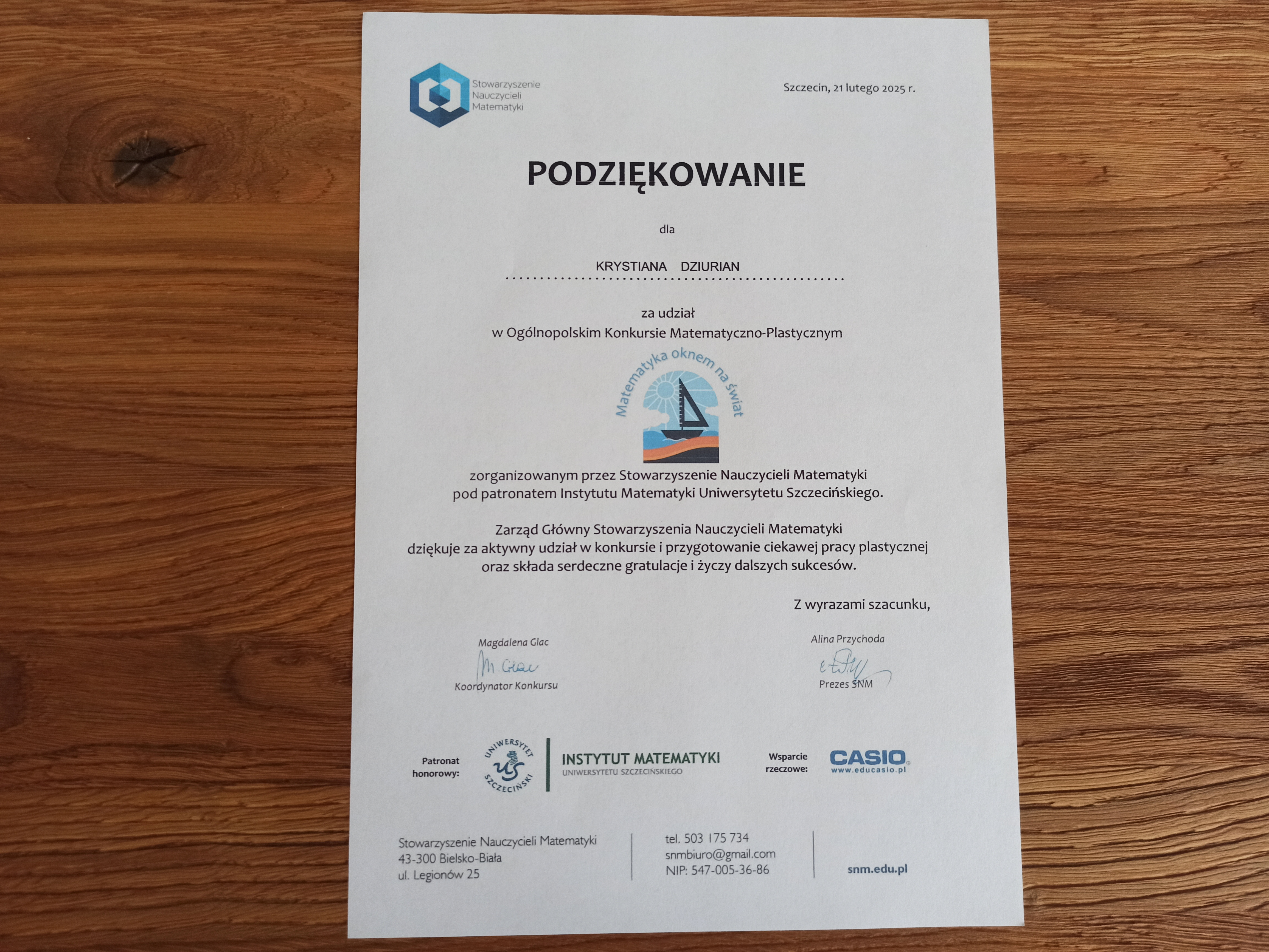 Uczeń klasy 3R Krystian Dziurian wziął udział w VIII Ogólnopolskim Konkursie Matematyczno -Plastycznym „Matematyka oknem na świat” organizowanym przez Stowarzyszenie Nauczycieli Matematyków.
