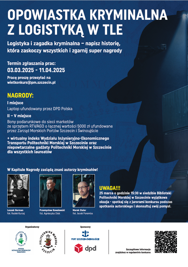 Gorąco zachęcamy młodzież naszej szkoły do wzięcia udziału w o ogólnopolskim konkursie organizowanym przez Wydział Inżynieryjno-Ekonomiczny Transportu Politechniki Morskiej w Szczecinie. Konkurs Opowiastka kryminalna z logistyką w tle to konkurs na opowiadanie o tematyce kryminalnej. Do wygrania są bardzo atrakcyjne nagrody.