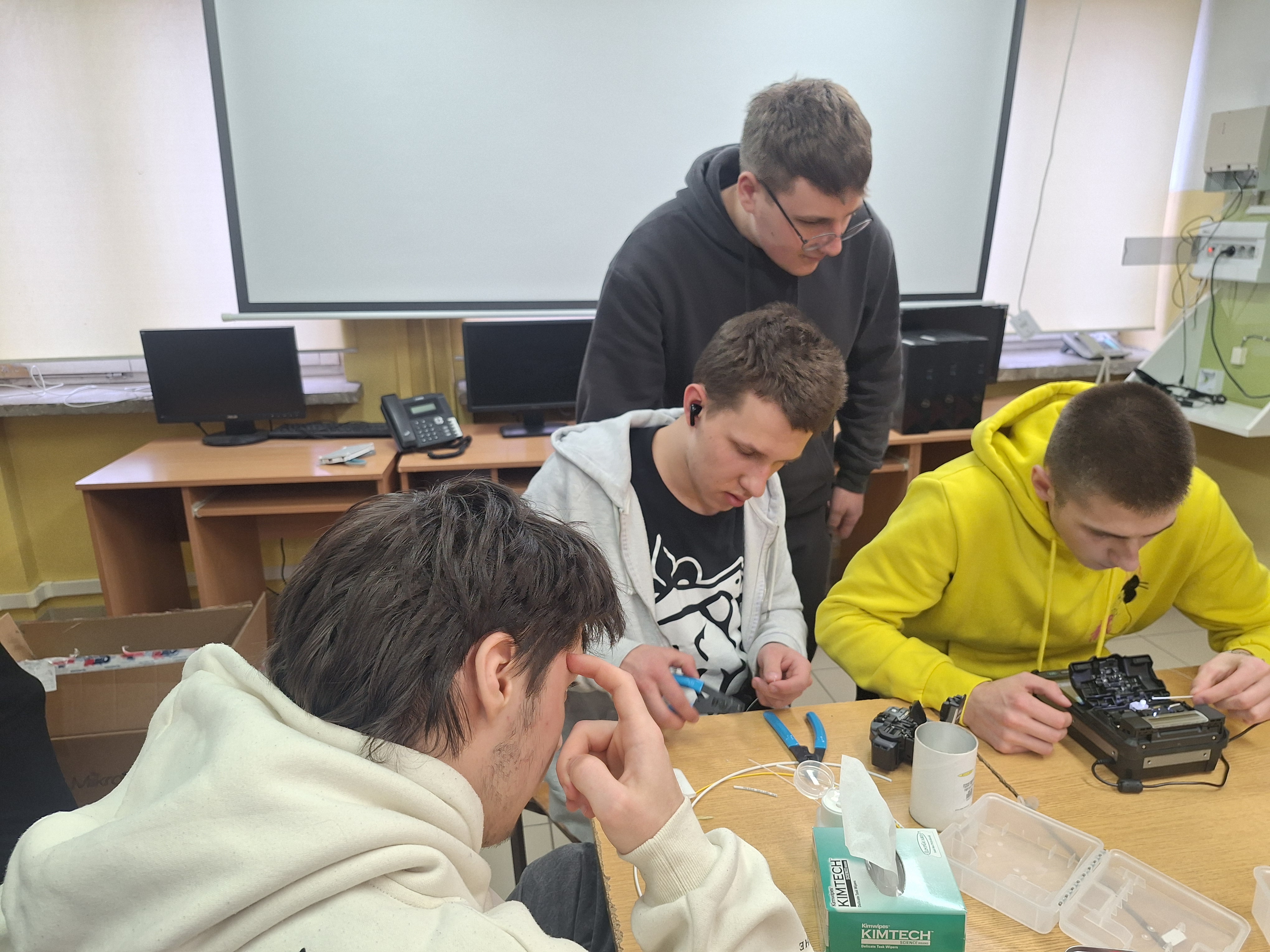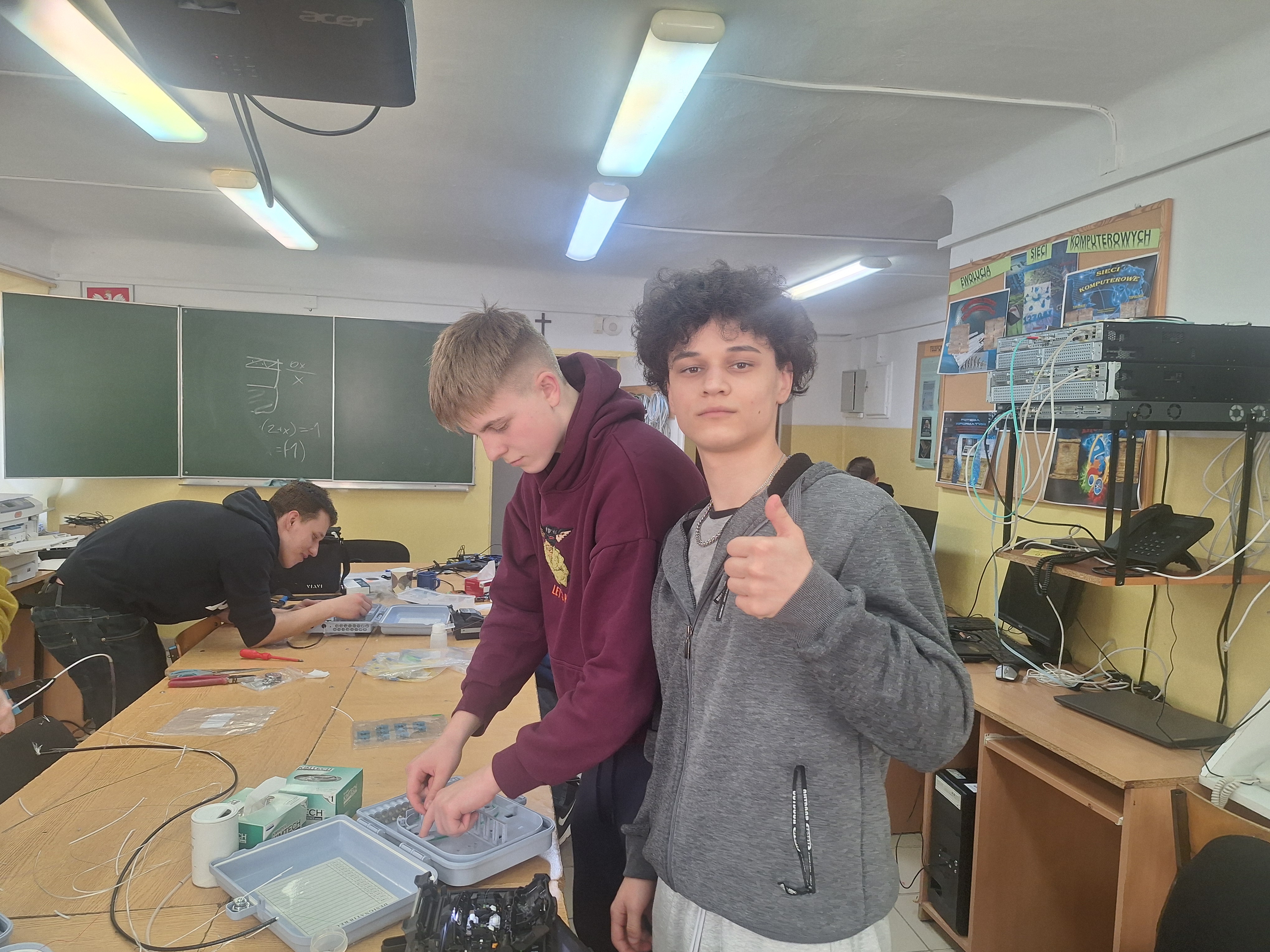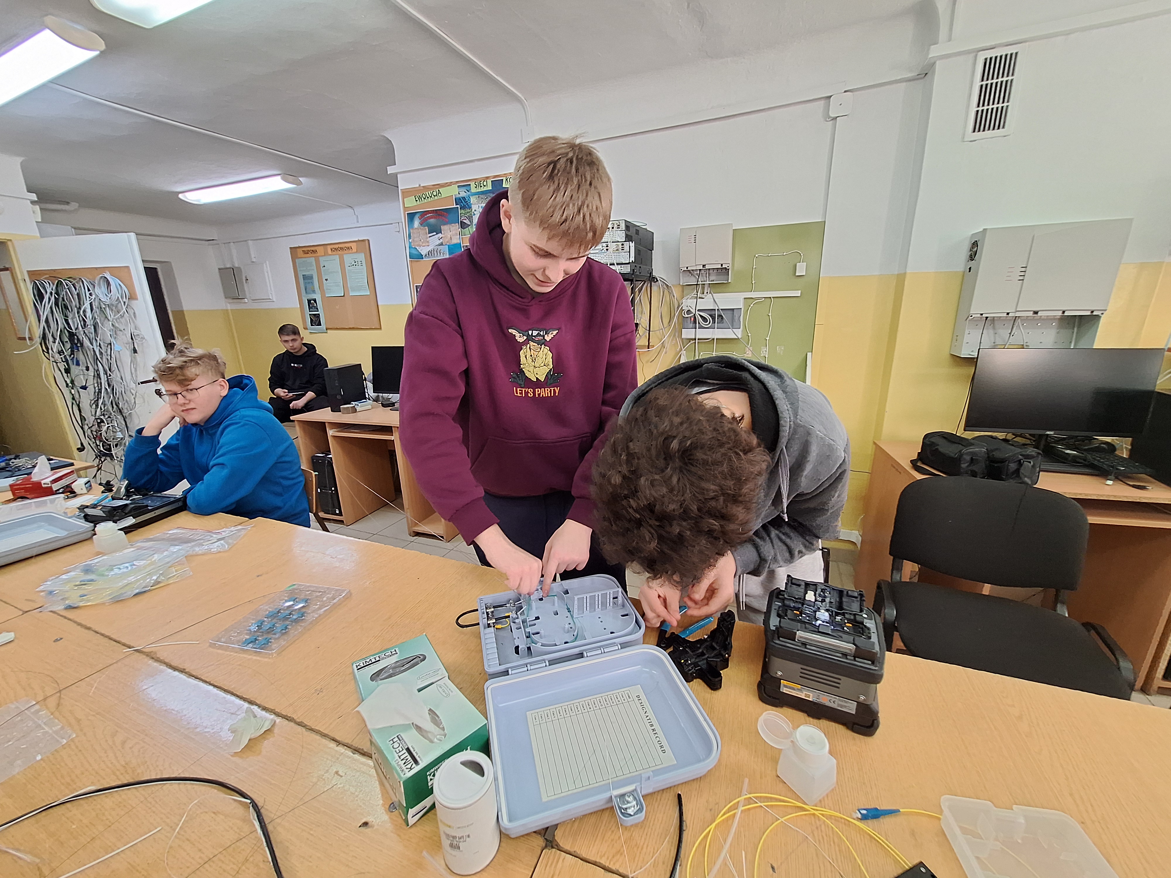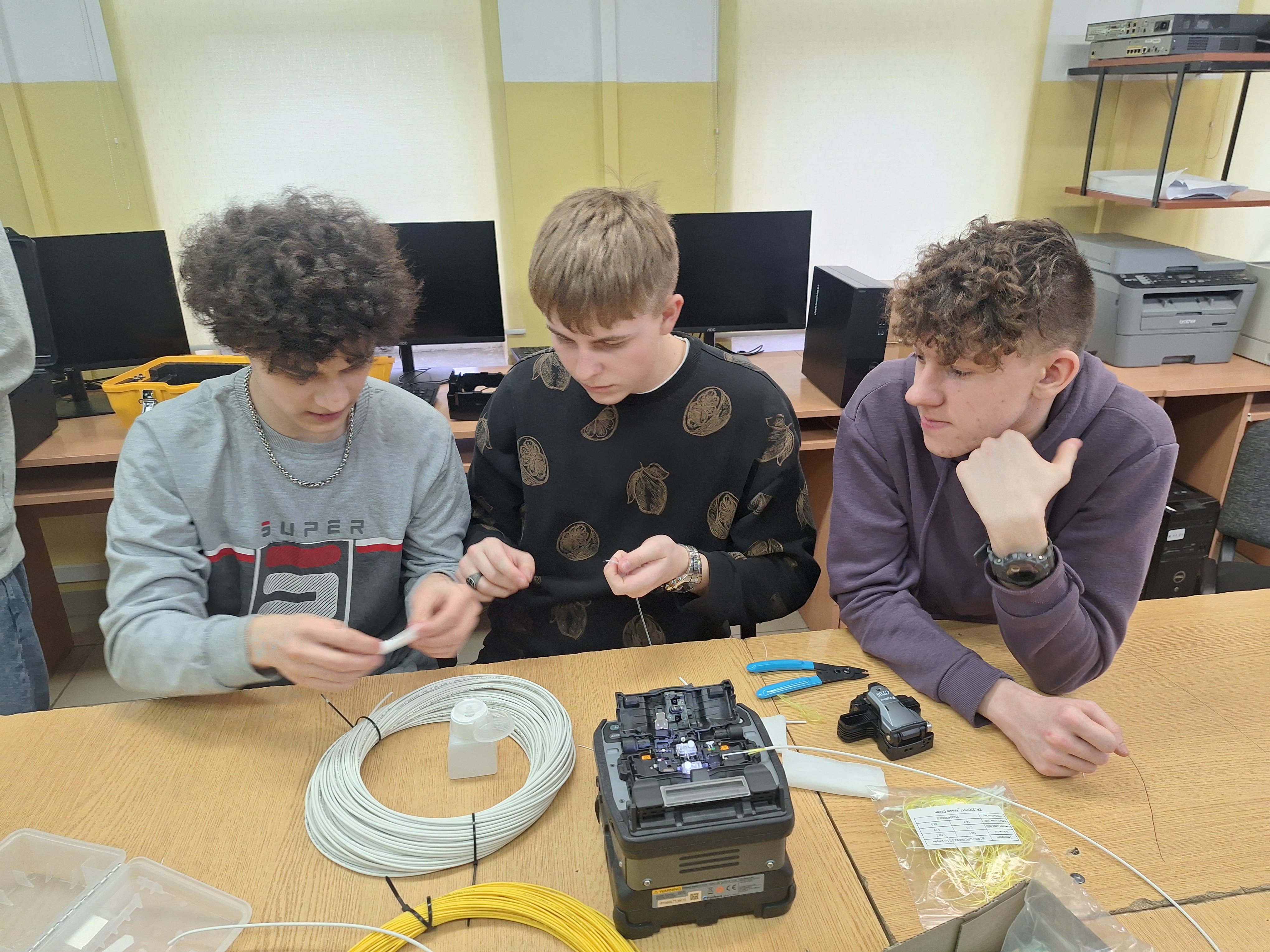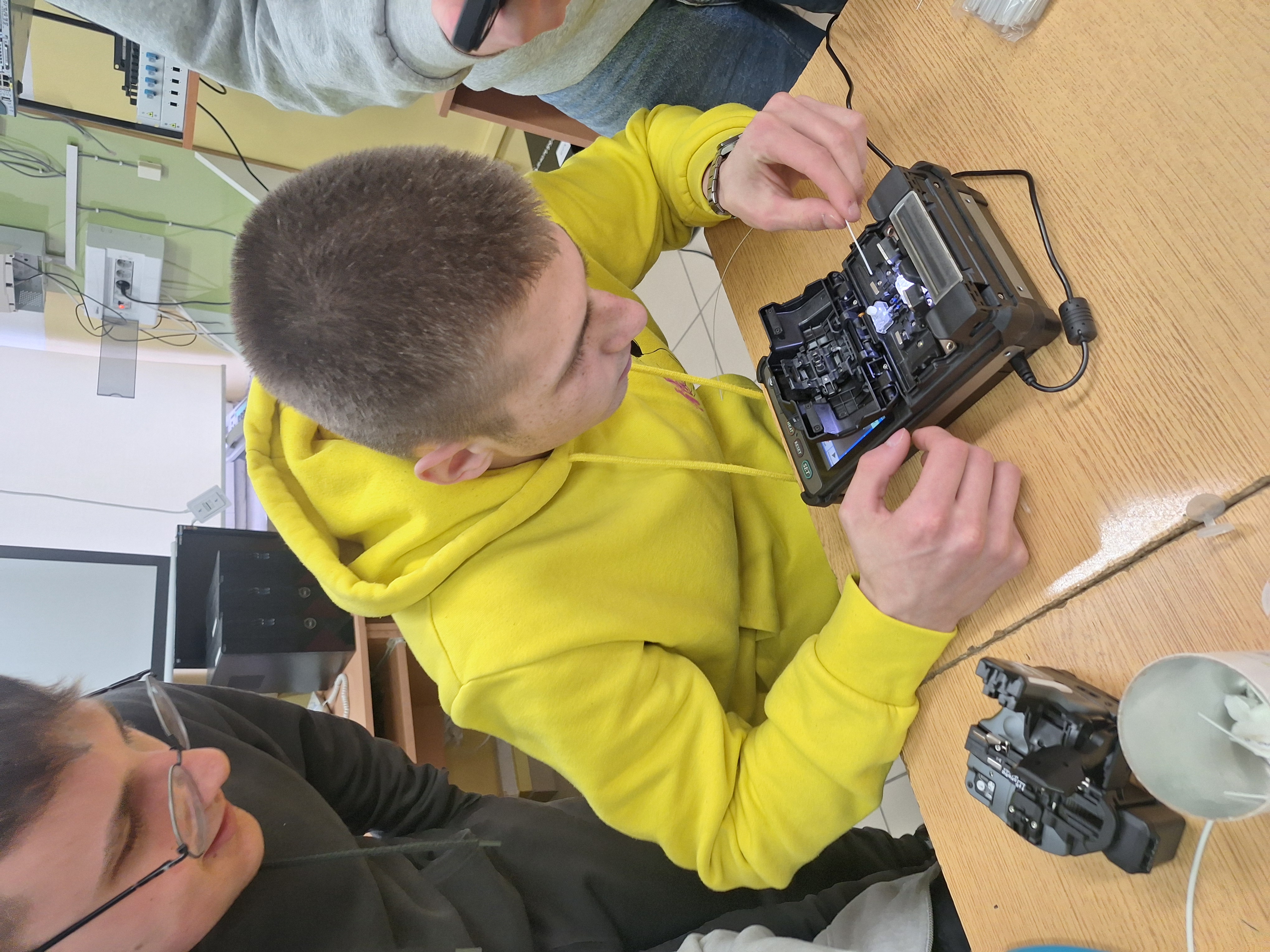 Podczas praktycznych zajęć z technologii światłowodowej uczniowie precyzyjnie spawają włókna światłowodowe, a następnie starannie układają je w specjalnej tubie ochronnej. Na początku zajęć przygotowywane są kable oraz włókna do spawania przy użyciu spawarek termicznych. Po wykonaniu spawów uczniowie zabezpieczają miejsca łączenia za pomocą złączek termokurczliwych, co zapewnia trwałość i ochronę połączenia. Na zakończenie włókna są porządkowane i umieszczane w hermetycznej kasecie, która chroni je przed uszkodzeniami mechanicznymi oraz wpływem czynników zewnętrznych. Zajęcia te pozwalają uczniom zdobyć praktyczne umiejętności niezbędne w nowoczesnej branży telekomunikacyjnej i doskonale przygotowują ich do pracy z technologią światłowodową.